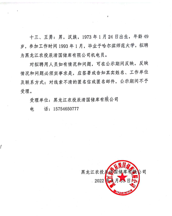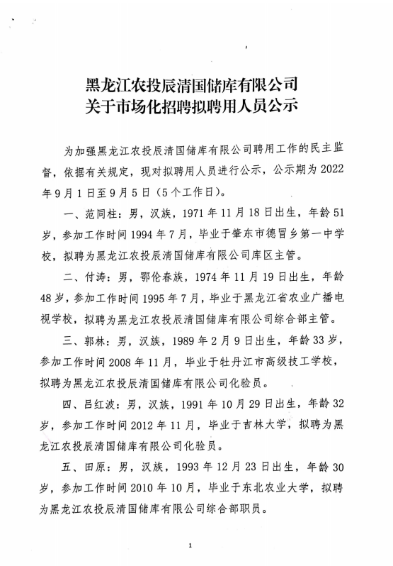 黑龍江農(nóng)投辰清國儲(chǔ)庫有限公司關(guān)于市場化招聘擬聘用人員公示