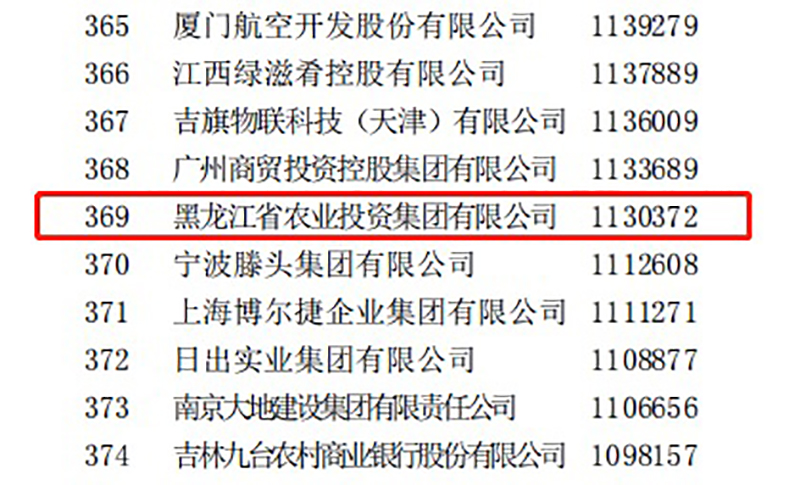 2021年9月25日,“2021中國500強企業(yè)高峰論壇”在長春舉行,中國企業(yè)聯(lián)合會、中國企業(yè)家協(xié)會在會上發(fā)布了中國服務(wù)業(yè)企業(yè)500強名單,黑龍江省農(nóng)業(yè)投資集團有限公司以2020年營業(yè)收入113.03億元的業(yè)績位列2021中國服務(wù)企業(yè)第369位。