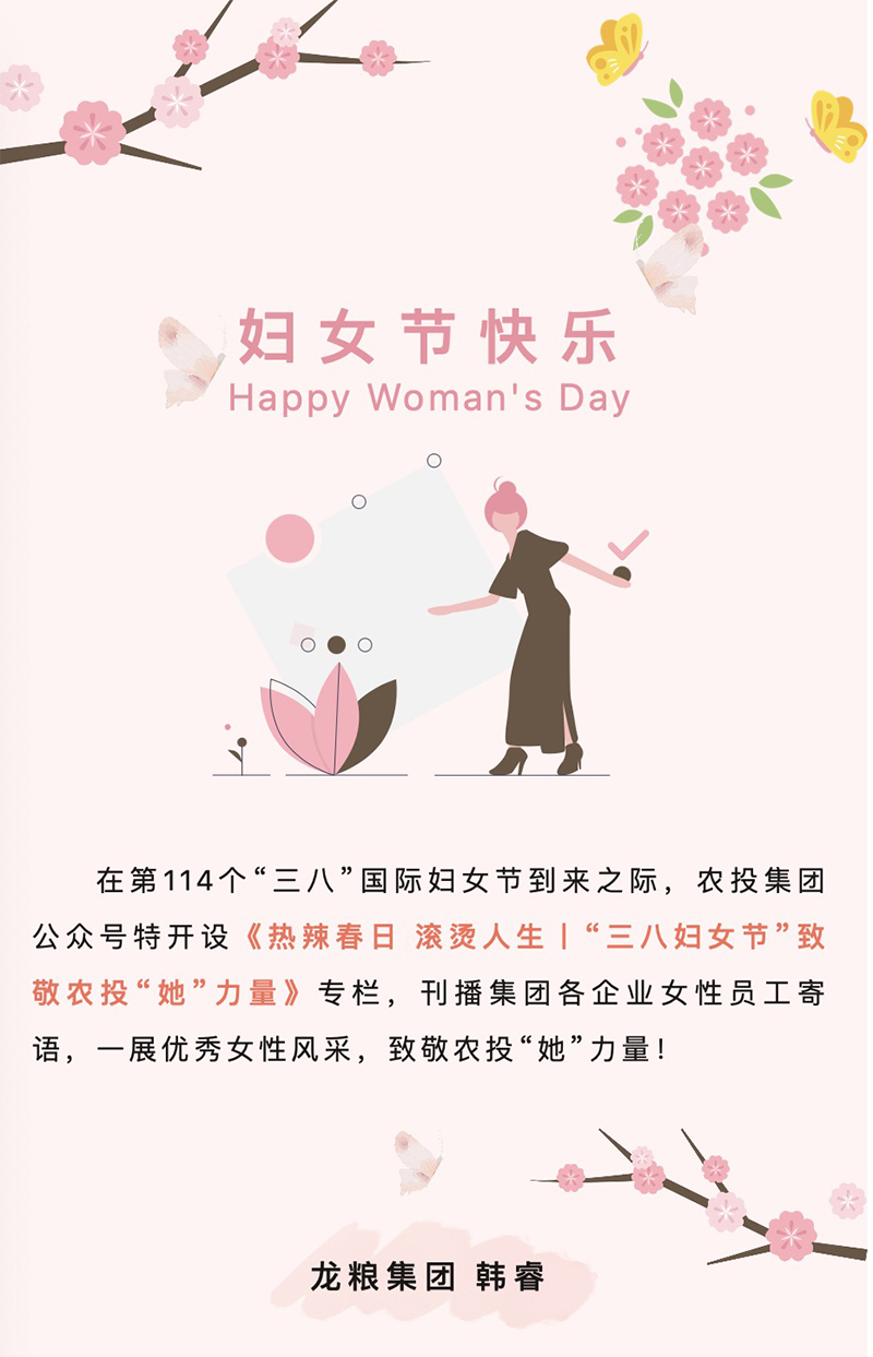 三月春風暖,萬象展新顏。在這春意盎然的季節(jié)里,我們滿懷希望迎來了第114個“三八”國際勞動婦女節(jié)。堅強與溫柔并存,作為新時代的女性,我們一直以力量和勇氣,來面對職場和生活中的挑戰(zhàn)。積極向上,完善自我,堅定信念,懷以熱情,向世界展示自己的價值。今后,我也會以優(yōu)雅的態(tài)度面對生活的挑戰(zhàn),以微笑的力量溫暖人心,在堅定理想信念中激揚巾幗之志,在弘揚文明新風中展現(xiàn)巾幗之美。值此節(jié)日,祝愿所有女性永遠熱愛!