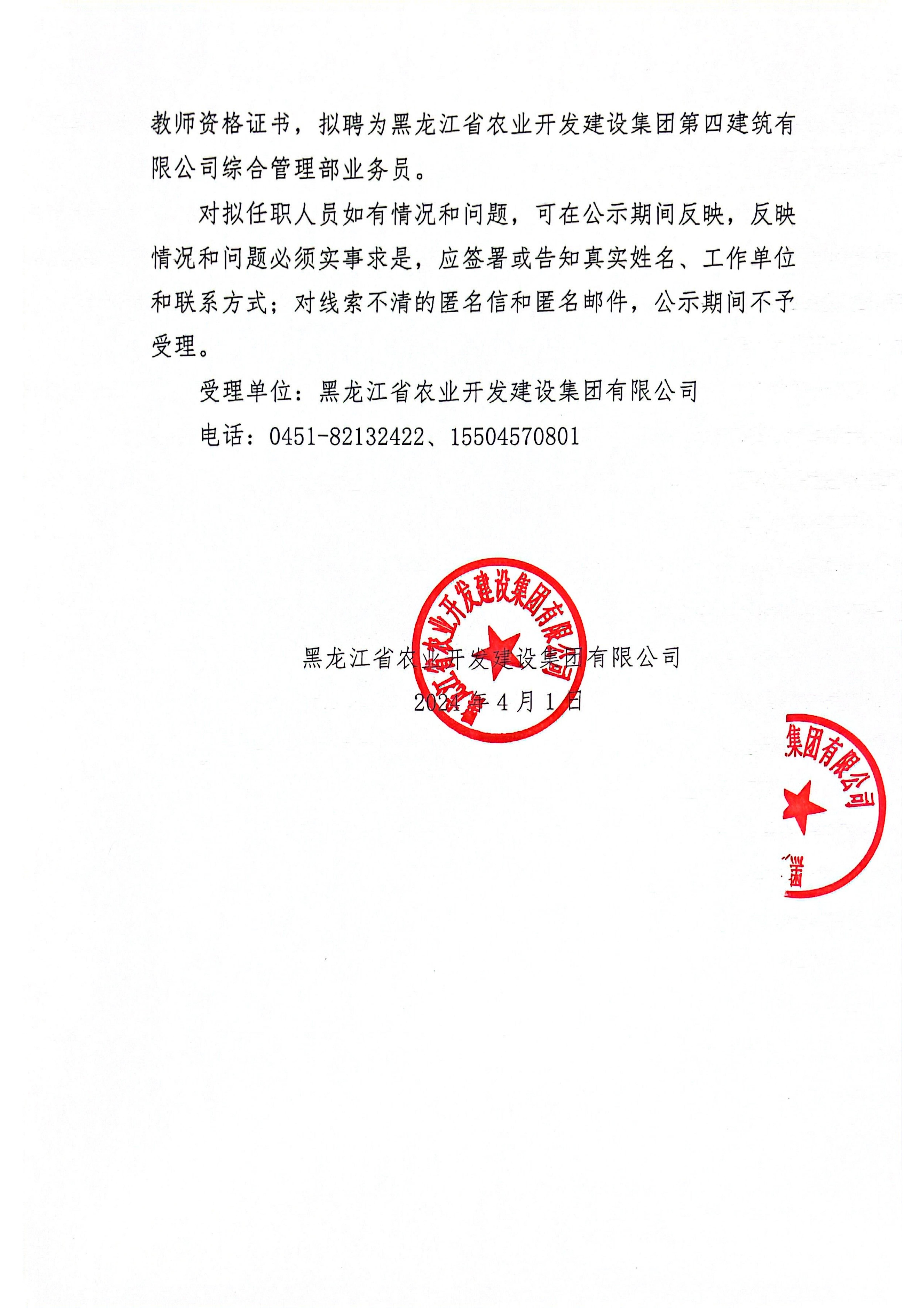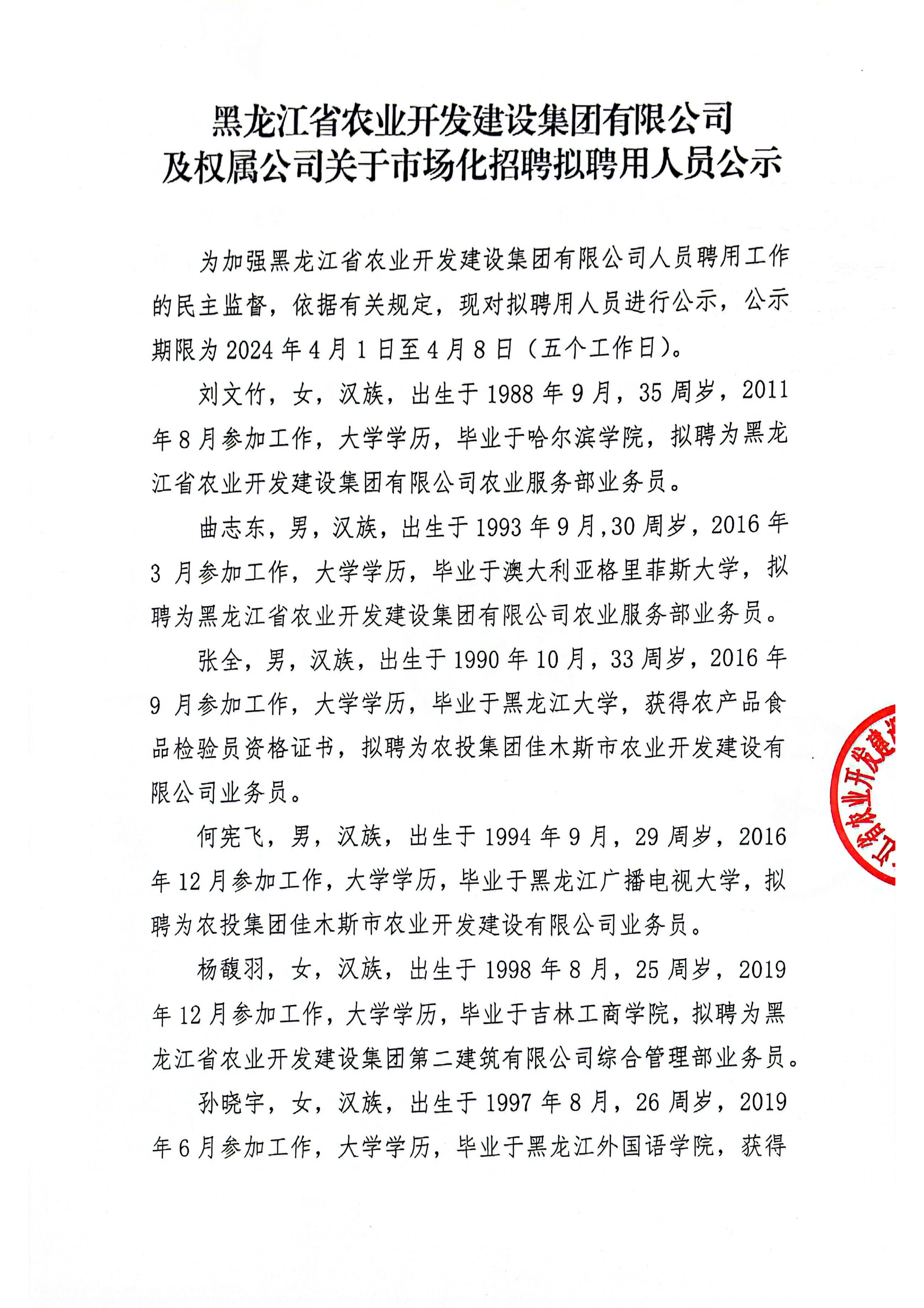 黑龍江省農(nóng)業(yè)開(kāi)發(fā)建設(shè)集團(tuán)有限公司及權(quán)屬公司關(guān)于市場(chǎng)化招聘擬聘用人員公示