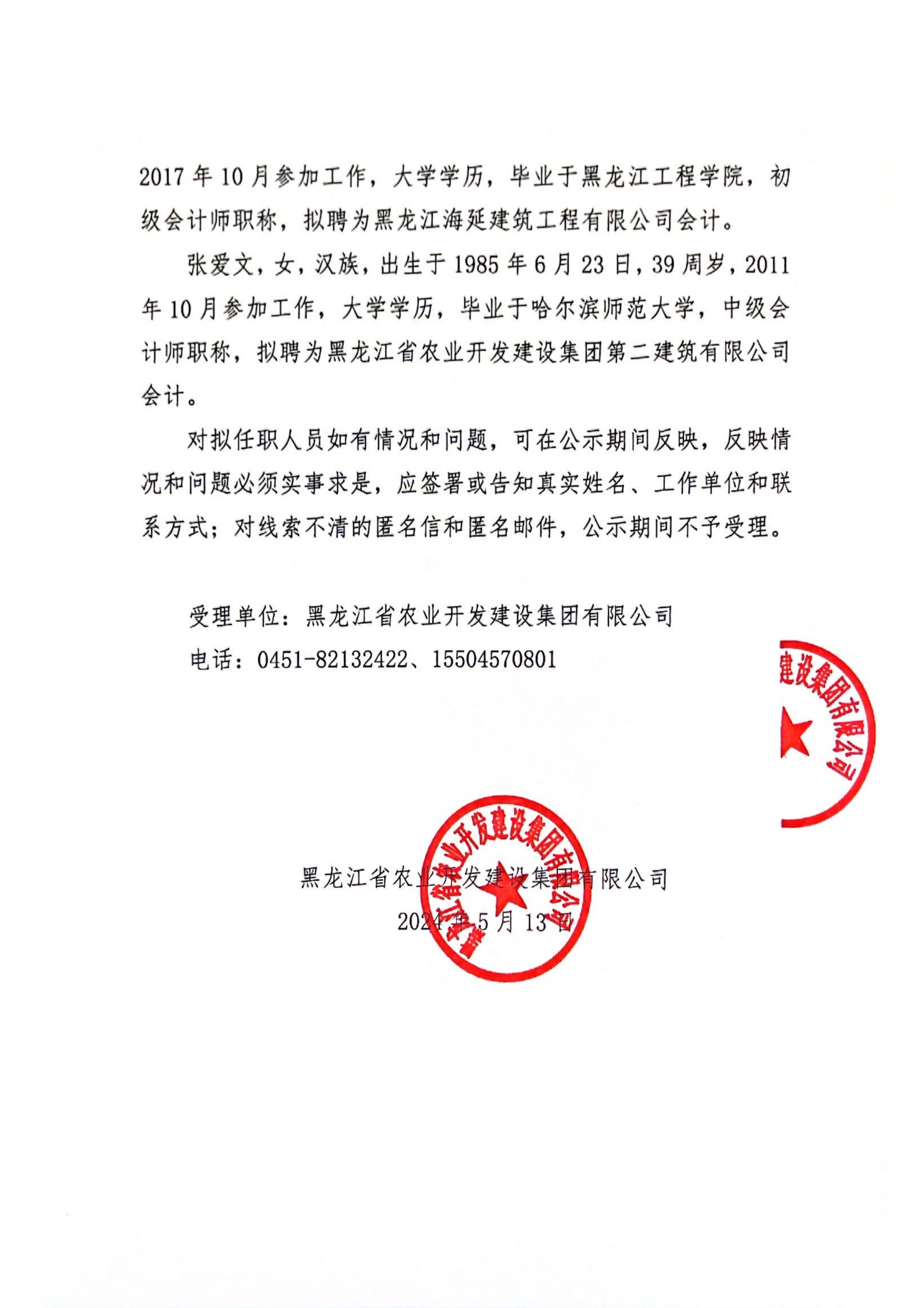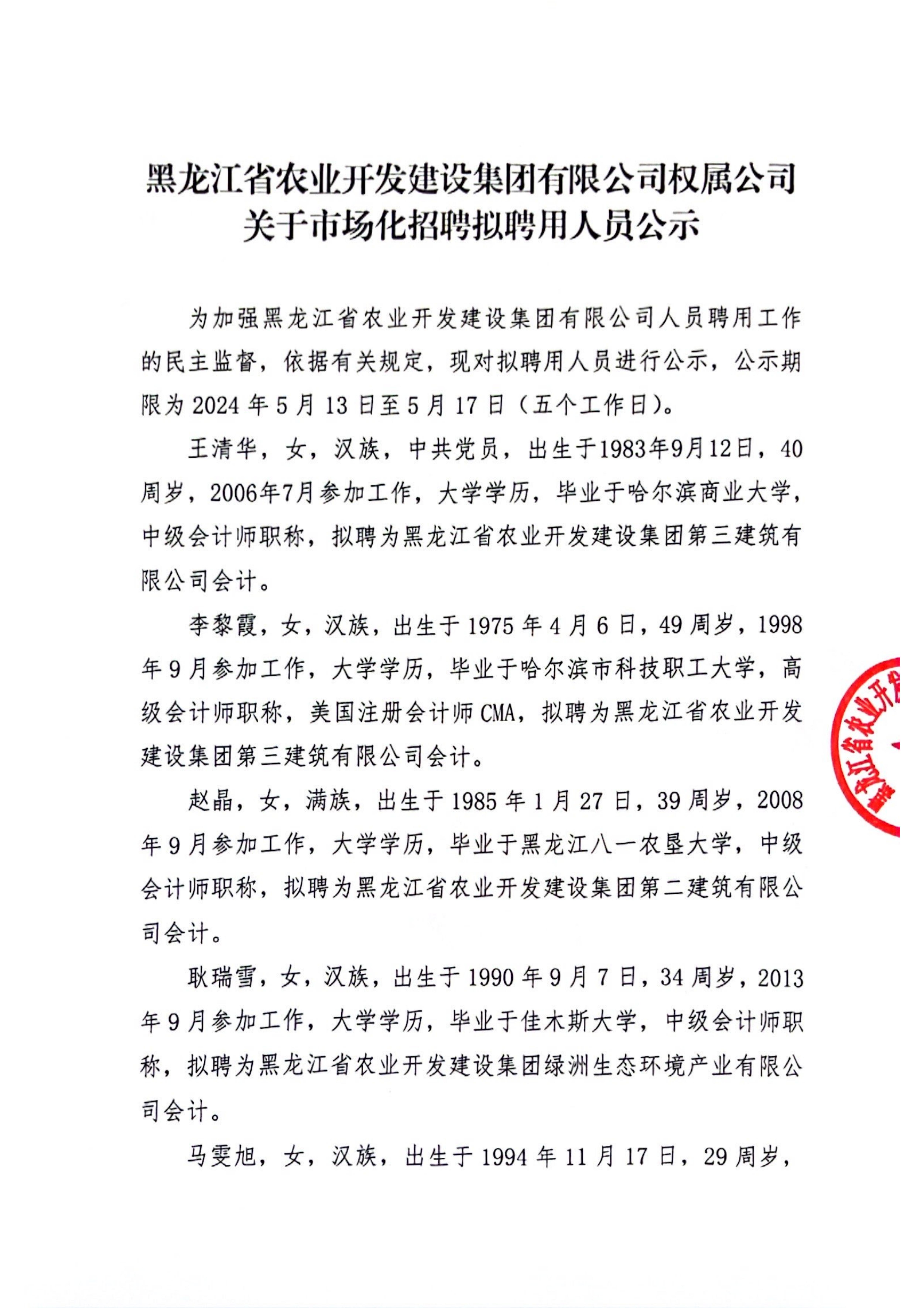 黑龍江省農(nóng)業(yè)開發(fā)建設(shè)集團(tuán)有限公司權(quán)屬公司關(guān)于市場(chǎng)化招聘擬聘用人員公示