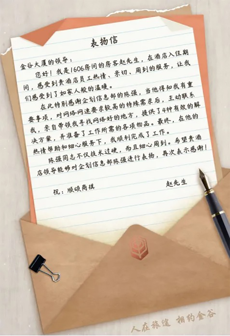9月27日趙先生及同伴兩人入住金谷大廈,因有重要工作事項需要處理,對網(wǎng)速有較高要求,客人通過服務(wù)中心聯(lián)系到陳強,陳強得知客人需求后,為客人提供了4種有效的解決方案,不斷進行測試、調(diào)整,確保網(wǎng)絡(luò)的速度和穩(wěn)定性,并貼心地為客人準備了工作所需的各項物品。在他熱情幫助和細心服務(wù)下,客人順利完成了工作,獲得領(lǐng)導(dǎo)的表揚,客人也對陳強的工作能力及服務(wù)態(tài)度給予了充分肯定。