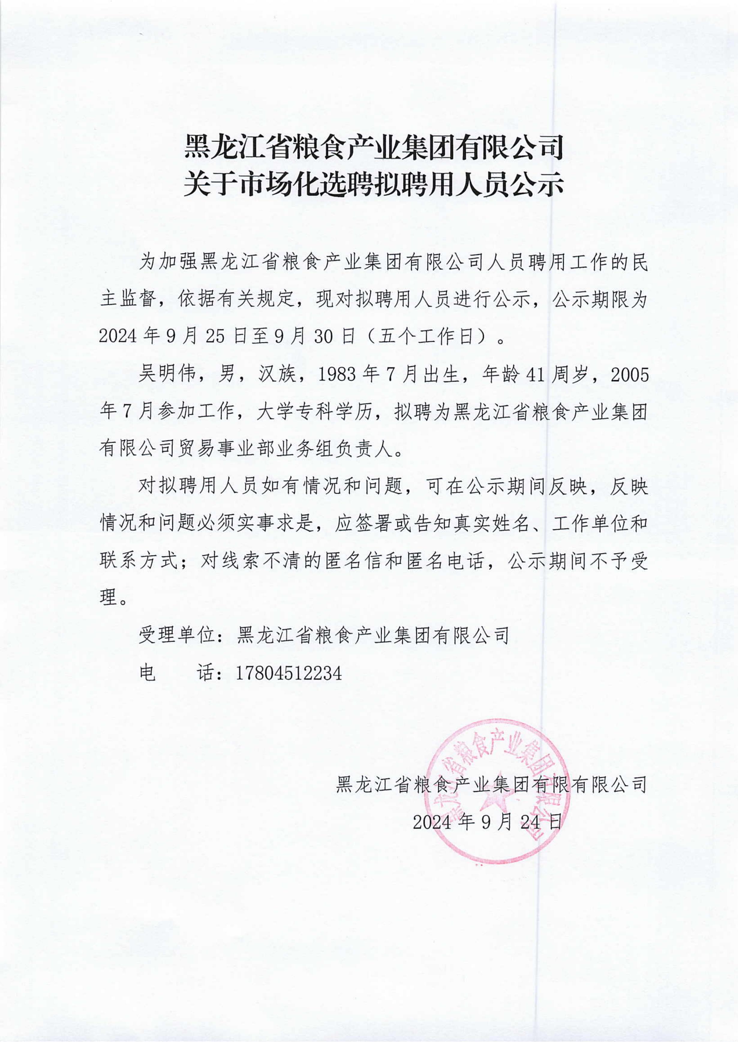 黑龍江省糧食產(chǎn)業(yè)集團(tuán)有限公司關(guān)于市場(chǎng)化選聘擬聘用人員公示