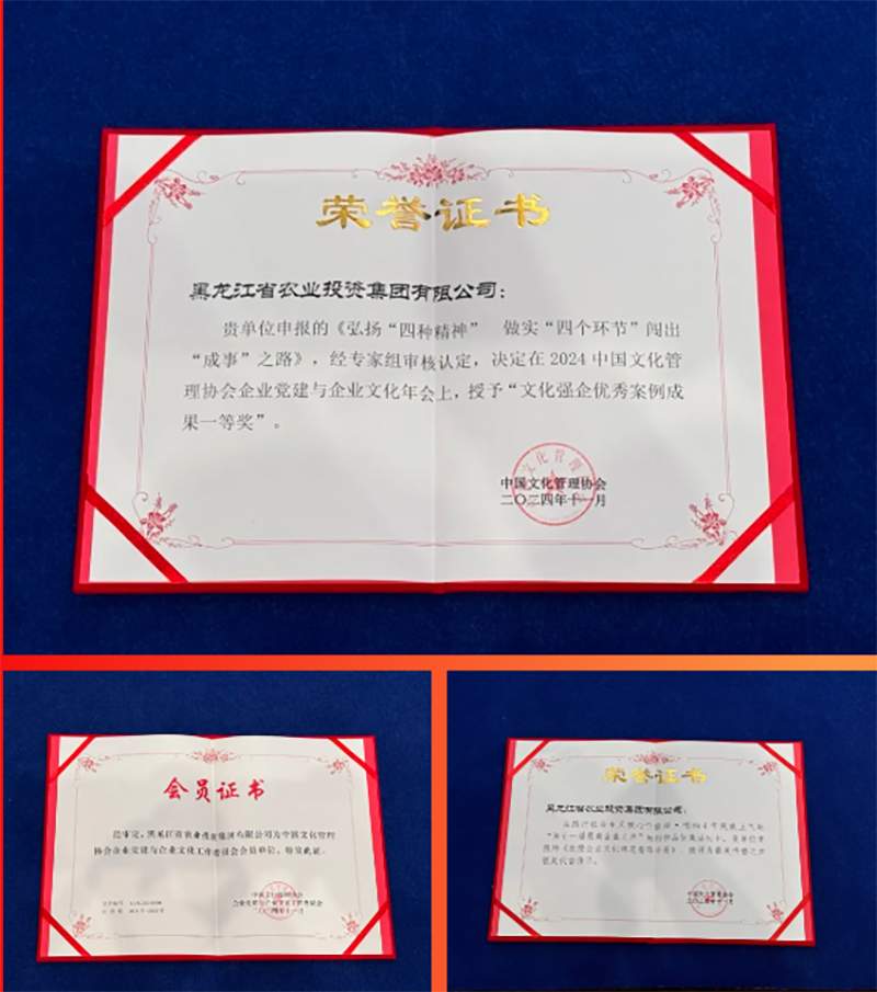 為貫徹黨的二十屆三中全會(huì)精神,進(jìn)一步推進(jìn)新時(shí)期企業(yè)黨建、文化建設(shè)深入有效開(kāi)展,11月12日-14日,2024中國(guó)文化管理協(xié)會(huì)企業(yè)黨建與企業(yè)文化年會(huì)在杭州召開(kāi)。會(huì)上,發(fā)布企業(yè)黨建與企業(yè)文化系列實(shí)踐創(chuàng)新成果,舉辦“第十一屆”最美企業(yè)之聲展播活動(dòng)。由黑龍江省農(nóng)業(yè)投資集團(tuán)有限公司(以下簡(jiǎn)稱(chēng)農(nóng)投集團(tuán))選送的《弘揚(yáng)“四種精神” 做實(shí)“四個(gè)環(huán)節(jié)” 闖出“成事”之路》榮獲文化強(qiáng)企優(yōu)秀案例成果一等獎(jiǎng),《農(nóng)投企業(yè)文化規(guī)范指導(dǎo)手冊(cè)》被評(píng)為“最美傳播之聲”銀獎(jiǎng)代言作品。