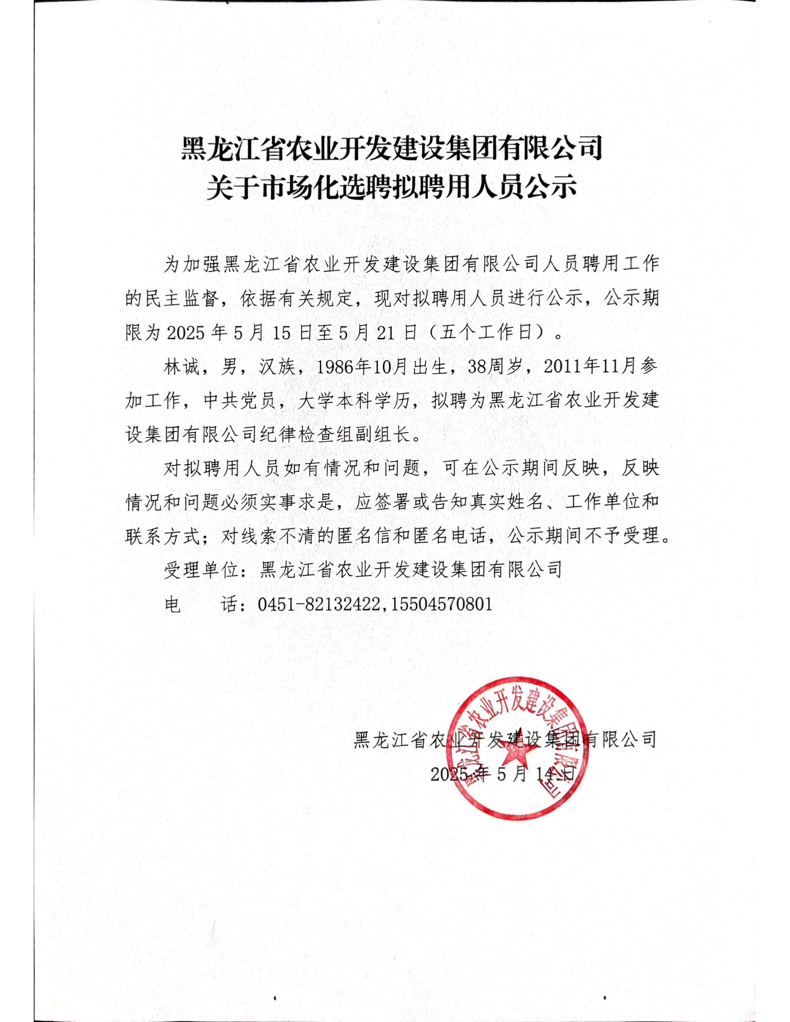 黑龍江省農(nóng)業(yè)開(kāi)發(fā)建設(shè)集團(tuán)有限公司關(guān)于市場(chǎng)化選聘擬聘用人員公示