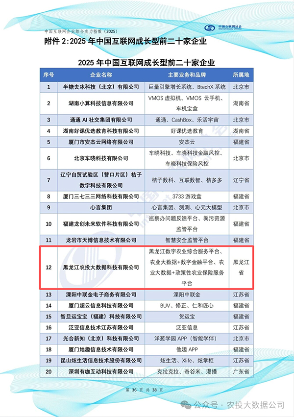 近日,《中國互聯(lián)網(wǎng)企業(yè)綜合實(shí)力指數(shù)(2025)發(fā)布會(huì)》在京舉行。農(nóng)投大數(shù)據(jù)公司憑借在農(nóng)業(yè)數(shù)字化領(lǐng)域的持續(xù)深耕與扎實(shí)成果,成功入選“2025年中國互聯(lián)網(wǎng)成長型前二十家企業(yè)”,位列第12名。這已是公司連續(xù)第三年榮登該榜單。